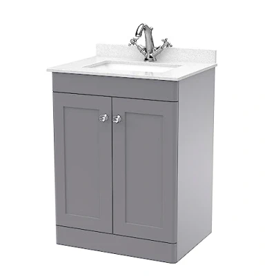 Eye catching and elegant, the Classique range of bathroom furniture from nuie combines Victorian inspired design with a contemporary twist. The traditional design is complemented in 5 modern colourways, with a large variety of different basins and worktops - to find the perfect unit for your bathroom. This floor standing vanity unit will endure as a much loved piece in your bathroom. With 2 soft close Shaker style doors and ample storage for the essentials to be kept tidily away. In a cool Satin Grey finish with light Chrome handles. Supplied rigid for easier installation. With a 1 tap hole Marble top with high quality vitreous china ceramic white basin. Manufactured from high quality materials and manufactured to our highest standards. Matching furniture available in the Classique furniture range from nuie for a beautifully traditional design in your bathroom. Tap and waste not included. DIMENSIONS - H: 878mm, W: 620mm, D: 470mm 5 year manufacturer's guarantee, Weight: 85.539357656 Pounds, Manufacturer: nuie