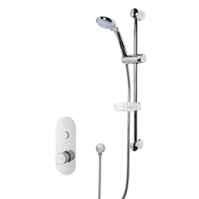 This sleek and modern shower bundle from nuie, brings together high quality pieces manufactured from brass in a chrome finish, and contemporary round designs. The bundle includes a valve, slide rail kit and outlet elbow, and it saves you money and time, for your brand new shower. The push button valve has full thermostatic control to prevent scalding in case of water shut down. The patented Valquest cartridge is manufactured in Great Britain, and is fully reversible. The easy to use push button valve has a backplate to hide unsightly plumbing, for a minimalist look to your bathroom. The slide rail kit makes showering easier with adjustable height. Comes with a single function handset, hose and round outlet elbow, creating the perfect bundle for your bathroom. Operating pressure needed of 0.10. DIMENSIONS - VALVE - H: 215mm, W: 80mm, D: 135mm. SLIDE RAIL KIT - H: 595mm, W: 168mm, D: 71mm. OUTLET ELBOW - H: 53mm, W: 53mm, D: 26mm. 5 year manufacturer's guarantee, Weight: 6.7902376696 Pounds, Manufacturer: Nuie