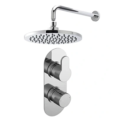 Nuie SBR15TW1 Bundle Modern Bathroom Twin Thermostatic Arvan Valve Wall Mounted Arm and Round Fixed Shower Head, Chrome