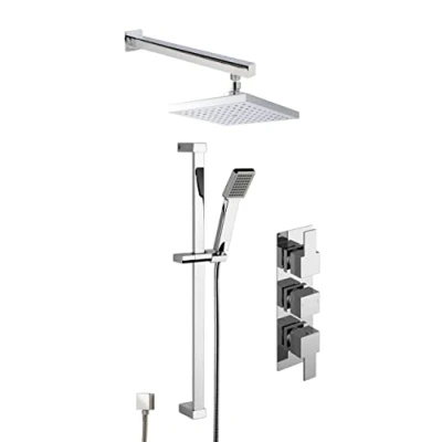 This sleek and modern shower bundle from nuie, brings together high quality pieces manufactured from brass in a chrome finish, and contemporary square designs. The bundle includes a concealed triple shower valve, slide rail kit, outlet elbow, arm and head, and it saves you money and time, for your brand new shower. The square lever handle triple valve has full thermostatic control to prevent scalding in case of water shut down. The patented Valquest cartridge is manufactured in Great Britain, and is fully reversible. The valve has a backplate to hide unsightly plumbing, for a minimalist look to your bathroom. With ceramic disc technology for a smooth operation and longer valve life. The slide rail kit makes showering easier with adjustable height. Comes with a single function handset, hose and square outlet elbow, creating the perfect bundle for your bathroom. Operating pressure needed of 0.50. The wall mount square arm perfectly complements the fixed round shower head, and lets the water elegantly flow to make your shower relaxing. DIMENSIONS - VALVE - H: 280mm, W: 120mm, D: 133mm. SLIDE RAIL KIT - H: 700mm, W: 660mm, D: 70mm. OUTLET ELBOW - H: 53mm, W: 36mm, D: 36mm. ARM - H: 51mm, W: 51mm, D: 350mm. HEAD -H: 60mm, W: 200mm, D: 200mm. 5 year manufacturer's guarantee, Weight: 13.1836432676 pounds, Manufacturer: Nuie