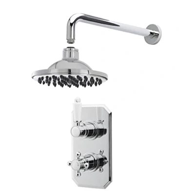 This elegant and traditional shower bundle from nuie, brings together high quality pieces manufactured from brass in a chrome finish, and rounded designs. The bundle includes a concealed thermostatic twin shower valve, arm and fixed head and it saves you money and time, for your brand new shower. The concealed twin thermostatic valve has a detailed backplate to hide unsightly plumbing, keeping a sleek finish to your bathroom. With both a lever and crosshead handle, this Victorian inspired valve has white ceramic details for added style. The valve has thermostatic temperature control and anti scald technology in case of water shut off. With ceramic disc technology for smooth operation and a longer valve life. The patented valve is manufactured in Great Britain, resistant to calcium build up, and can be fitted both vertically and horizontally. Operating pressure of 0.10. The wall mount curved arm perfectly matches the round fixed shower head, holding it high above to let the water elegantly flow. The shower head is easy to clean and stain rust resistant, keeping it like new and fresher for longer. DIMENSIONS - VALVE - H: 210mm, W: 120mm, D: 135mm. ARM -H: 85mm, W: 60mm, D: 400mm. HEAD - H: 185mm, W: 152mm, D: 421mm. 5 year manufacturer's guarantee, Weight: 8.8846291586 pounds, Manufacturer: Nuie
