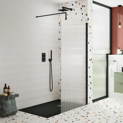 General description Nuie Fluted Wet Room Screen combines modern elegance with functionality, featuring a stunning fluted design that infuses Art Deco style into your bathroom. This 1850mm high and 1000mm wide shower screen is crafted from 8mm toughened safety glass, providing both strength and clarity. The included matt black support bar not only enhances the aesthetic but can also be cut to size for convenience. Technical specifications Height: 1850mm Width: 1000mm Glass Thickness: 8mm Weight: 43.77 Kg Adjustment Range: 975-993mm Material: Glass with Aluminium Profile Profile Finish: Matt Black Installation During installation, extra care must be taken to avoid damaging the fittings. The support bar is supplied with a T piece for the support arms and can be adjusted to fit your specific needs. Usage This wet room glass shower screen is perfect for creating a modern bathroom environment, offering additional privacy while enhancing the overall design. It is suitable for both compact