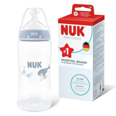 NUK First Choice Baby Bottle 3+ Months 300ml Anti Colic Feeding PP Temperature Control Indicator Whale 1 Count