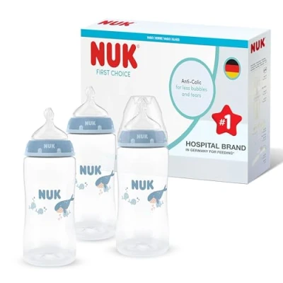 #1 HOSPITAL BRAND IN GERMANY FOR FEEDING*: High quality, trusted baby bottles LESS BUBBLES & TEARS: The NUK anti-colic air system promotes calm, natural drinking, meaning less air gets into baby's tummy TEMPERATURE CONTROL INDICATOR: Take the guesswork out of preparing milk; the indicator scale on the bottle changes from blue to white if its contents are too hot** EASY TO FILL & CLEAN: Wide bottle neck for seamless use during busy days and nights MADE IN GERMANY: Crafted with care, made with high-quality materials and thoughtful design