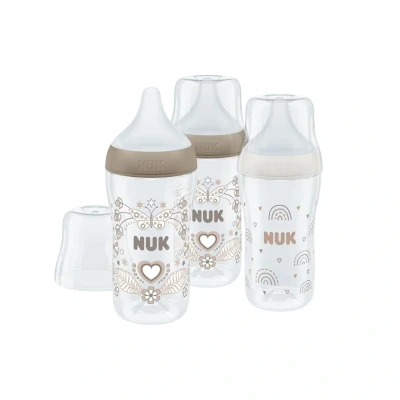 NUK Perfect Match Baby Bottles Set, 3+ Months, Adapts to Baby's Palate, Temperature Control, Anti Colic Vent, 260 ml, BPA Free, Medium Silicone Teat, Rainbow & Heart, 3 Count