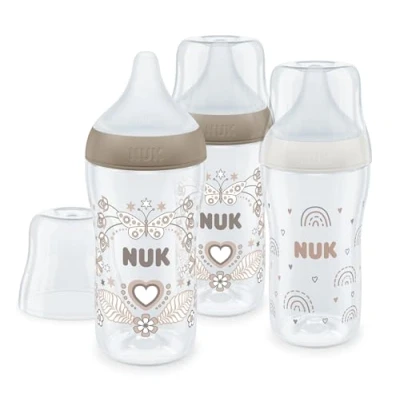Why Buy Me? The NUK Anti-Colic Perfect Match baby bottle is thoughtfully designed to provide the ultimate feeding experience for your little one. Its ultra-soft and elastic teat mimics the natural feel of a mother’s skin, gently adapting to your baby’s lips and palate for a comfortable latch. The innovative Anti-Colic vent helps prevent air intake, reducing the risk of colic and ensuring a more relaxed feeding session. With three teat size options, the milk flow can be perfectly adjusted to suit your baby’s needs. This 260ml bottle also features a built-in Temperature Control Indicator, which changes color from blue to white when the milk is too hot, offering peace of mind and added safety during feeding. Cleaning is effortless, thanks to the easy-to-disassemble 4-part system, making it a practical choice for busy parents. The charming Rainbow & Heart design adds a touch of style to functionality, making this pack of three bottles an ideal companion for your baby's feeding journey. Brand: NUK Product Type: Bottle Feeding Product Sub-type: Anti Colic How to Use? Before first use, wash and sterilize all parts of the bottle. Pour the desired amount of milk or formula and ensure the bottle is securely assembled to avoid leaks. Use the Temperature Control Indicator to check if the milk is too hot (blue to white). Allow the milk to cool to a safe temperature before feeding. After use, disassemble and clean all parts thoroughly, and always inspect the teat for wear or damage. Age: 3+ months Details: Calm and Relaxed Feeding Innovative Anti-Colic vent prevents air swallowing, reducing the risk of colic and ensuring comfortable feeding. Features 3 teat size options to regulate milk flow perfectly for your baby’s needs. Built-in Temperature Control The indicator on the bottle changes color to show if the milk is too hot, ensuring safety and peace of mind. Easy Cleaning and Transporting The 4-part system can be disassembled quickly for hassle-free cleaning. A leak-proof lid ensures no spills, making it perfect for on-the-go use. Dimensions: Height 19.3cm x Length 7.2cm x Width 21.3 cm