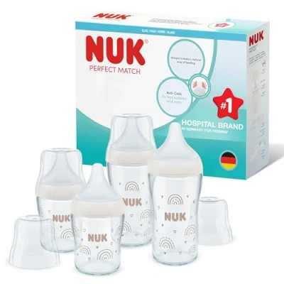 NUK Perfect Match Glass Baby Bottles Set 3+ Months Adapts to Baby's Palate Temperature Control Anti Colic Vent 120 ml & 230 BPA Free Silicone Teats Rainbow 4 Count