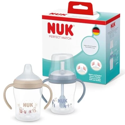 NUK Perfect Match Learner Bottle & Straw Cup 8+ Months 150ml Leak Proof Sippy Cups Toddler Bottles Anti Slip Handles Monkey Penguin 2 Count
