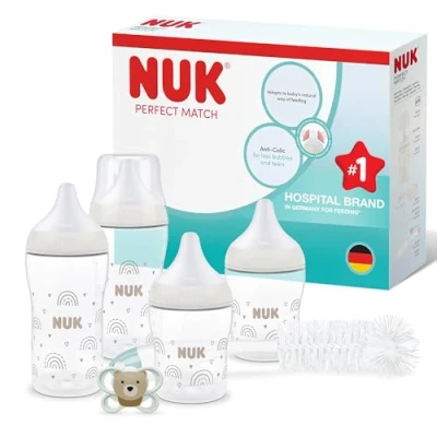NEWBORN ESSENTIALS: The complete baby care set featuring anti-colic baby bottles, orthodontic dummies, extra bottle teats and a bottle brush #1 HOSPITAL BRAND IN GERMANY FOR FEEDING*: High quality, trusted baby bottles ADAPTS TO BABY'S NATURAL WAY OF FEEDING: The soft and flexible teat is made from familiar skin-like silicone, mimicking mum's breast as closely as possible DESIGNED FOR SENSITIVE SKIN: NUK Perfect Match Air soothers feature extra large openings that allow baby's delicate skin to breathe, promoting air flow and helping to prevent drool rash FOR HEALTHY TEETH & JAW DEVELOPMENT**: NUK soothers offer peace of mind for parents, with an orthodontic shape that has the least impact on baby's natural oral development