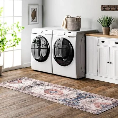 Stylish and Practical: The Nuloom SpinClean Machine Washable Collection offers an affordable, low-maintenance solution without compromising on style. This collection features a wide array of designs, from vintage to southwestern, boho, abstract, and modern geometric. Machine Washable for Easy Care: Maintaining this rug is a breeze with regular vacuuming and spot cleaning to preserve its beauty. For tougher stains, just toss your rug in the washing machine on a gentle cycle with cold water. We recommend line drying or using the air-only drying cycle without heat. Designed for Every Room: This area rug is kid and pet-friendly, making it ideal for any space in your home that needs an elevated touch. It ensures lasting style in your living room, bedroom, dining room, kitchen, bathroom, home office, dorm room, as a hall runner or entrance rug. Sleek and Functional Pile Height: The low pile of this area rug brings a sleek, sophisticated touch while being easy to clean and maintain. Designed to be placed conveniently under furniture and doorways or as an indoor entrance rug, this is the perfect high traffic rug for your home. Stain-Resistant Material: Our machine washable rugs are crafted from synthetic materials that are stain-resistant, lightweight, and easy to clean. The stain-resistant properties ensure that the rug maintains its vibrant colors and patterns, even after enduring the demands of everyday use. If your rug is located in an area that receives direct sunlight, regularly rotate your rug to maintain its appearance. Durable Design with Non-Slip Backing: This rug’s power-loomed design is made to endure everyday wear and tear, ensuring long-lasting durability. The integrated non-slip backing keeps the rug securely in place while the reinforced, quality-stitched edges enhance its resilience. For added comfort, pair it with one of our rug pads for an extra cushioned feel underfoot.