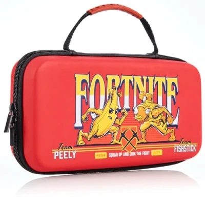 Bright and bold digitally printed design featuring Peely, Fishstick, and iconic Fortnite artwork Sturdy outer shell provides reliable protection against drops, scratches, and impacts Compatible with both Switch and Switch 2 consoles, includes EVA insert for original model Mesh pocket holds up to 10 game cartridges, plus space for small accessories and charging cables Comfortable rubber handle with reinforced webbing makes it easy to travel with your console, Platforms: Nintendo Switch 2