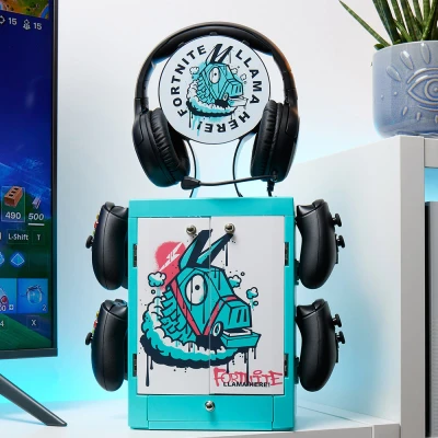 Take your gaming setup to the next level with the Fortnite Gaming Locker, inspired by the iconic Llama loot container. This sleek, space-saving storage solution is perfect for keeping your gaming gear organised while showcasing your love for Fortnite. With its bold design and practical features, it's a must-have for any dedicated player looking to keep their accessories within easy reach. Designed to store up to ten PS4, PS5, Switch, or Xbox Series X|S games and Blu-ray movies, this locker offers fully adjustable interior shelves to customise your storage space. It features four side mounts for controllers and a dedicated stand on top to securely hold your gaming headset. Whether you're setting up for a long battle royale session or just keeping your space tidy, this locker ensures everything has its place. Complete with a handy bottom drawer for storing cables, remotes, and other essentials, this officially licensed Fortnite gaming locker keeps your setup neat, organised, and ready for action. Designed and engineered by Numskull, it’s the ultimate accessory for Fortnite fans who want to keep their gaming space looking as sharp as their victory royale skills.