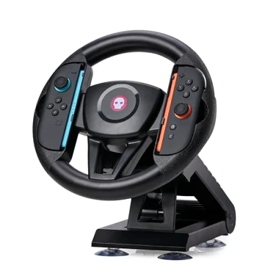 This Joy-Con steering wheel table attachment is designed for Switch 2 and enhances motion-controlled racing games with a more immersive and realistic hands-on driving experience. The patented steering wheel design includes built-in resistance to simulate authentic steering feedback, adding greater control and realism to racing gameplay. Strong suction cups securely attach to smooth, clean, flat, non-porous surfaces such as glass, polished wood, metal and laminate to provide stable, slip-resistant performance. It is suitable for smooth, non-porous surfaces only and is not recommended for textured, matte, uneven, porous or dusty areas; ensure the surface is clean and dry before use. Soft inner mounting brackets hold Joy-Con controllers firmly in place while helping to protect them from scratches, scuffs and damage during intense racing sessions., Platforms: Nintendo Switch 2