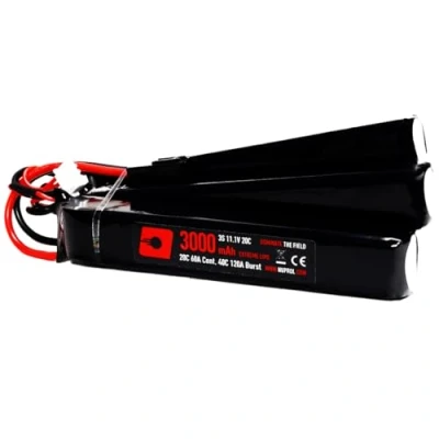 STATS - LiPo | 11.1v | 3000 mAh | 20C/40C @ 60A/120A (Cont/Burst) - Airsoft AEGs use the "Burst" flow rate to start the motor, and then the "Cont" flow rate to provide continuous discharge (check your owners manual to ensure the battery purchased meets the minimum flow rate (C) of your AEG) - this battery provides approximately 3 minutes of continuous discharge before running flat LITHIUM POLYMER - LiPo batteries have an excellent size/weight to capacity ratio, allowing you to fire more shots with a smaller battery. LiPo batteries can be recharged at any charge level without damaging the overall capacity of the battery. LiPo batteries should not be "run-flat", as this can damage the battery and effect overall charge ability. LiPo batteries MUST be charged with a LiPo Balance Charger. LiPo batteries should always be charge in a fire-retardant Safe-Charging-Bag NUNCHUCK - this battery is split to help find its place in small battery compartments. Commonly fitted inside the buttstock of rear wired Airsoft Replicas where the buffer tube is not hollow (example EBB - Electric-Blow-Back AEGs). Also for fitting around the barrel, within the handguard of front wired Airsoft Replicas. Always check the dimensions of the battery vs the battery compartment to ensure compatability MINI TAMIYA - this battery is suitable for Airsoft Replicas using a Mini-Tamiya battery connector QUALITY CONTROL - NP Power batteries are produced at an ISO 9000 Quality Control accredited manufacturing plant and shipped at an optimal charge rate of ≥60% to protect against degradation when in transport/ storage