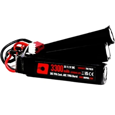 STATS - LiPo | 11.1v | 3300 mAh | 30C/60C @ 99A/198A (Cont/Burst) - Airsoft AEGs use the "Burst" flow rate to start the motor, and then the "Cont" flow rate to provide continuous discharge (check your owners manual to ensure the battery purchased meets the minimum flow rate (C) of your AEG) - this battery provides approximately 2 minutes of continuous discharge before running flat LITHIUM POLYMER - LiPo batteries have an excellent size/weight to capacity ratio, allowing you to fire more shots with a smaller battery. LiPo batteries can be recharged at any charge level without damaging the overall capacity of the battery. LiPo batteries should not be "run-flat", as this can damage the battery and effect overall charge ability. LiPo batteries MUST be charged with a LiPo Balance Charger. LiPo batteries should always be charge in a fire-retardant Safe-Charging-Bag NUNCHUCK - this battery is split to help find its place in small battery compartments. Commonly fitted inside the buttstock of rear wired Airsoft Replicas where the buffer tube is not hollow (example EBB - Electric-Blow-Back AEGs). Also for fitting around the barrel, within the handguard of front wired Airsoft Replicas. Always check the dimensions of the battery vs the battery compartment to ensure compatability DEANS (T) - this battery is suitable for Airsoft Replicas using a Deans (T) battery connector QUALITY CONTROL - NP Power batteries are produced at an ISO 9000 Quality Control accredited manufacturing plant and shipped at an optimal charge rate of ≥60% to protect against degradation when in transport/ storage