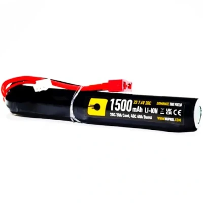 STATS - Li-Ion | 7.4v | 1500 mAh | 20C/40C @ 30A/60A (Cont/Burst) - Airsoft AEGs use the "Burst" flow rate to start the motor, and then the "Cont" flow rate to provide continuous discharge (check your owners manual to ensure the battery purchased meets the minimum flow rate (C) of your AEG) - this battery provides approximately 3 minutes of continuous discharge before running flat LITHIUM ION - Li-Ion batteries have an excellent size/weight to capacity ratio, allowing you to fire more shots with a smaller battery. Li-Ion batteries have a long lifespan and can undergo 1000s of charging cycles. Li-Iono batteries MUST be charged with a Li-Ion Balance Charger STANDARD - this battery is a common airsoft battery design, for fitment in the stock buffer tube of rear wired Airsoft Replicas. Always check the dimensions of the battery vs the battery compartment to ensure compatability DEANS (T) - this battery is suitable for Airsoft Replicas using a Deans (T) battery connector QUALITY CONTROL - NP Power batteries are produced at an ISO 9000 Quality Control accredited manufacturing plant and shipped at an optimal charge rate of ≥60% to protect against degradation when in transport/ storage