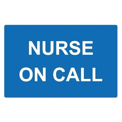 Nurse on call hospital safety sign. 1mm flexible Plastic sign. Digitally printed for extra durability. Drill and screw in position or use double sided tape to mount onto suitable surface. All signs come with a 5-year warranty. All our signs are UV resistant meaning they will not fade in sunlight. Suitable for indoor & outdoor use.