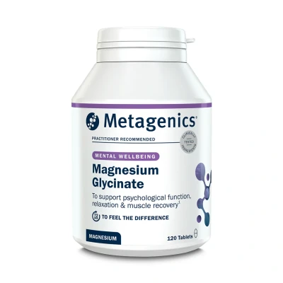 High-strength, bioavailable magnesium glycinate tablets () by Metagenics (), providing dual action sleep support, plus support for muscle recovery, relaxation, and energy production. Magnesium is an essential mineral that supports sleep and various other health areas, including the nervous system and muscle function. Low levels of magnesium are surprisingly common in the UK. Magnesium isn’t absorbed well by itself, which is why magnesium supplements () come in different forms. Magnesium glycinate is highly bioavailable, meaning it is easily absorbed by the body, making it more effective than cheaper forms of magnesium. Metagenics magnesium glycinate is a pure chelated magnesium bisglycinate – meaning magnesium is chelated, or joined, to two molecules of glycine. Magnesium bisglycinate has been shown to be better-absorbed and tolerated than many other forms of magnesium on the market. Some other magnesium glycinate products may be labelled as such, but can also contain magnesium oxide too – to raise the level of magnesium in the product.