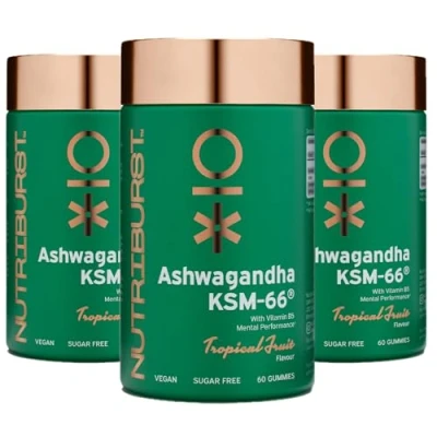 💡REDUCE TIREDNESS & EXPERIENCE BETTER MENTAL PERFORMANCE WITH 300mg GOLD STANDARD ASHWAGANDHA EXTRACT, KSM-66. Ashwagandha, also known as ‘Indian ginseng’, is described as a herbal adaptogen. Our gummies are formulated with demanding lifestyles in mind, including Vitamin B5 (3mg), Iodine (75µg), and Pantothenic acid to reduce fatigue. Our Ashwagandha complex is designed to help improve psychological and physical health, from energy and focus to the body's resistance to stress and anxiety. ⚕️ENJOY TWO TROPICAL GUMMIES EVERY MORNING. This is a multi pack (3 month supply - 180 gummies). This gummy is formulated with Iodine, which helps support cognitive and neural function and vitamin B5, which plays a role in supporting mental performance. Ashwagandha has been used for centuries to promote a healthy response to stress, support mental clarity, and aid concentration. There is evidence to suggest that it can reduce inflammation and protect the body against a variety of conditions. ⭐ FEEL CONFIDENT IN THE QUALITY OF YOUR SUPPLEMENTS. We carefully select premium ingredients, with superior bioavailability to support your daily nutritional needs. All our botanical extracts are premium, traceable, and guaranteed to contain standardised quantities of actives. KSM-66 uses only the root of the Withania somnifera plant. We have also selected our balanced blend of ionic minerals Concentrace, delivering a concentrated complex of naturally occurring ionic trace minerals. 🌱 EXPERIENCE ADVANCED NUTRITION WITH CLEAN RESOURCES & NATURAL INGREDIENTS. Nutriburst was formed out of a desire to produce vitamins that are the perfect supplementation to the human body. We use clean resources with active ingredients in their most bioavailable forms, that are sweetened from plants and are, in fact, zero sugar and have only natural fruit flavours and natural food colours. Our supplements are free from gluten, artificial flavours and colours. ♻️ FEEL GOOD FOR CONSUMING SUSTAINABLE NUTRITIONAL SUPPLEMENTS. Our supplements are manufactured responsibly in an earth-positive way to continually reduce our impact on our environment and on the various ecosystems that impact our production cycle. We are committed to perfecting our practices to use the Earth's resources responsibly, without polluting the environment, eliminate wastage and supplement our resource consumption by giving back to our various ecosystems.