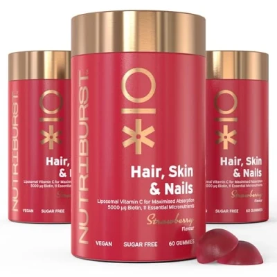 💡 EXPERIENCE HEALTHIER HAIR, STRONGER NAILS & GLOWIER SKIN. Our Hair, Skin and Nails Gummies contain 11 vitamins and minerals; Vitamin A (400mg), D3 (5 µg), E (6mg), C (50mg), B6 (1.4mg), B9 (200 µg), B12 (6 µg), B7 (5000mg), B5 (6mg), Zinc (5mg) and Iodine (150mg). Liposomal Vitamin C plays an important role in making collagen, essential for nourishing and plumping your skin. Biotin and Zinc Citrate help to maintain optimal skin health and function. ⚕️ENJOY TWO STRAWBERRY BERRY GUMMIES EVERY MORNING.This is a multi pack (3 month supply - 180 gummies). Deficiencies in essential minerals can interrupt the hair growth process, causing nails to become brittle and break and skin to become dull. Our gummies are packed with antioxidants! Folic acid & B12 stimulate the production of keratin for thick, glossy hair. Sugar isn’t skin-friendly, so these sugar-free gummy vitamins give you one less thing to worry about. ⭐ FEEL CONFIDENT IN THE QUALITY OF YOUR SUPPLEMENTS. Our vitamins are sourced from a sustainable, plant-based supply and suitable for vegans. Research has consistently shown that Vitamin D3 is superior at raising levels of Vitamin D in the body. We also selected Zinc Citrate, with superior bioavailability as well as our blend of naturally occurring ionic minerals from Utah's inland sea. Sugar-free, vegan, contain no artificial flavours, no artificial colours, gluten-free, kosher and halal. 🌱 EXPERIENCE ADVANCED NUTRITION WITH CLEAN RESOURCES & NATURAL INGREDIENTS. Nutriburst was formed out of a desire to produce vitamins that are the perfect supplementation to the human body. We use clean resources with active ingredients in their most bioavailable forms, that are sweetened from plants and are, in fact, zero sugar and have only natural fruit flavours and natural food colours. Our supplements are free from gluten, artificial flavours and colours. ♻️ FEEL GOOD FOR CONSUMING SUSTAINABLE NUTRITIONAL SUPPLEMENTS. Our supplements are manufactured responsibly in an earth-positive way to continually reduce our impact on our environment and on the various ecosystems that impact our production cycle. We are committed to perfecting our practices to use the Earth's resources responsibly, without polluting the environment, eliminate wastage and supplement our resource consumption by giving back to our various ecosystems.