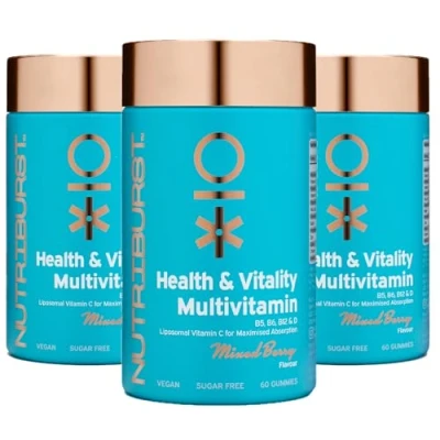 🌱 WHAT’S IN THIS VITAMIN? Flavoured with natural berry extracts, this plant-based, chewable all in one multivitamin for adults (both men & women) contains 13 carefully selected vitamins & minerals. Delicious daily multivitamins that deliver the nutritional support your body needs, in a form you’ll actually want to eat. Each gummy contains Vitamin C (18mg), D (1.5µg), E (15mg), A (750µg), B6 (0.7mg), B12 (4µg), B5 (5mg), Zinc (2.2mg), Folic Acid (240µg), Biotin (60µg), Iodine, Cholin & Inositol. 🌿 BENEFITS: Vitamin C supports the immune system and helps form healthy red blood cells; B5 helps make proteins and fight stress; B6 helps release energy from your food and supports nerve function; B12 is important for fighting fatigue; Biotin supports a healthy metabolism; Folic acid helps cell growth; Vitamin D supports immune health and contributes to the maintenance of healthy bones and muscles and Zinc supports cognitive function, vision, healthy hair and nails. 💡 ABOUT OUR GUMMIES: This is a multipack (3 month supply - 180 gummies). Take 2 gummies per day, each jar contains 60 gummies. All our chewy gummies include active ingredients to give you a great blend of vitamins for your wellbeing. All our products are sugar free and use plant-based sweeteners instead. Why gummies not tablets? Gummy vitamins are more easily absorbed by the body, easier to swallow & taste better! Suitable for teenagers and anyone over the age of 12. 💚 VEGAN & CRUELTY-FREE: Nutriburst gummies are proudly vegan & vegetarian friendly, non gmo, cruelty free, gluten free and contain no artificial flavours. They are also free from nuts, eggs, milk and soy. All our vitamins have been made to the highest quality and have been independently lab tested. Our manufacturing facility is BRC approved. Both the bottle and lid are recyclable and we have also partnered with Plastic Bank to help reduce ocean waste. ⭐ WHY NUTRIBURST? A unique range of delicious sugar-free and vegan gummies enriched with vitamins, botanical extracts, and minerals, designed to leave your mind and body feeling invigorated and uplifted. Supplements are really helpful to help make up for a shortfall in nutrients, especially where diets are deficient in minerals and vitamins. Nutriburst gummies taste great, come in ideal nutrient combinations and