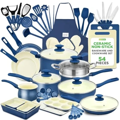 Nutrichef 54 Piece Marble Non Stick Cookware and Bakeware Set, Professional Home Kitchen Collection with Multi Sized Pots, Pans, Heat Resistant Tools