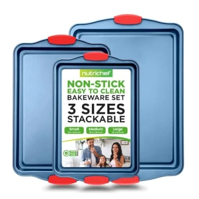 NutriChef, Bakeware Set, Baking Sheets, Cookie Sheet Pan, Tray, Nonstick, Blue Carbon Steel Professional Kitchen Oven Trays, Roasting Pans, 3 pc.