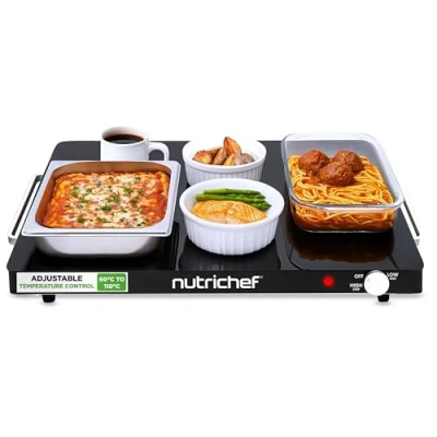 ADJUSTABLE TEMPERATURE CONTROL: Electric warming tray with rotary control knob allowing temperature adjustment from 60°C to 110°C; ideal for keeping food warm without overcooking during buffets, parties, family meals or catering events LARGE GLASS SERVING SURFACE: Spacious 59 x 44 cm tempered glass warming tray provides even heat distribution; suitable for multiple dishes, casseroles or serving trays, making it a practical food warmer for tables or countertops VERSATILE FOR EVENTS AND ENTERTAINING: Food warmer hot plate designed for home dining, buffets, parties and catering; use as a buffet server, plate warmer or hot serving tray to keep meals ready to serve for longer SAFE AND EASY TO USE: Simple rotary temperature control with indicator light for intuitive operation; stay-cool side handles allow safe carrying and repositioning of the warming tray during service SPACE SAVING AND PORTABLE DESIGN: Slim electric warming tray stores flat when not in use; a compact alternative to bulky buffet warmers or hostess trolleys, ideal for modern kitchens, entertaining spaces and catering setups, Weight: 10.5 pounds, Manufacturer: NutriChef