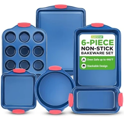 NutriChef Kitchen Oven Baking Pans, Carbon Steel Bakeware Set, Deluxe Nonstick Cookie & Muffin Sheet Pan Style, Blue Coating w/ Red Silicone Handles, Safe 6 Pc Set