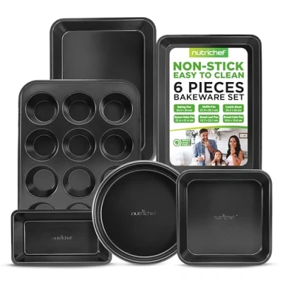 6-PIECE NON-STICK BAKEWARE SET: This NutriChef baking pans set includes a cookie sheet tray, wide baking pan, square baking dish, muffin tin, loaf tin, and round cake tin for all baking needs at home NON-STICK & NON-TOXIC COATING: Features a durable PTFE PFOA PFOS-free nonstick surface for effortless food release and healthy cooking with a heat-resistant lacquered exterior that withstands oven temperatures up to 230°C HEAVY-DUTY CARBON STEEL DESIGN: Each baking tray and dish is made from warp-resistant carbon steel adding strength to your bakeware collection suitable for fan ovens conventional ovens and toaster ovens EASY TO CLEAN & STACK: Nonstick baking pans provide excellent food release and fast cleaning these baking supplies are dishwasher-safe and feature a space-saving stackable design for kitchens with limited storage OVEN-SAFE & STYLISH: Designed for even baking this oven tray set handles everything from cakes to cookies and roasts a must-have nonstick bakeware set for every kitchen