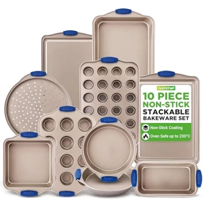 10 PIECES OVEN PANS: The 10 Piece Baking Pan Set offers complete kitchenware for baking cake, loaf, or muffins. Includes Baking Pan, Pizza Pan, Small Cookie Sheet, Round Pan, Square Pan, Loaf Pan, Big Cookie Sheet, Cup Muffin Pan, and Cup Muffin Pan NON-STICK GOLD COATING: Made of carbon steel metal with a non-stick gold coating inside and out, these pans may be used without using butter or oil. It also allows for easy meal release, as well as the absence of any strange odors or odors BAKING PANS SAFENESS: You don't need to worry about these baking pans being harmful since it is PFOA, PFOS, PTFE Free, Dishwasher Safe and it also has blue silicone handles to prevent accidental burns DIFFERENT SHAPES PANS: Use our many various molds, including small and large, square, rectangular, and round-shaped pans, to broaden your cooking horizons and create tasty handmade delicacies for the whole family BUILT TO LAST: The kitchen oven baking pans have features of flexible and non-stick with an attractive gold coating. Long-lasting as it is a stain-resistant and easy to clean, constructed by carbon steel with a metal tray thickness of 0.4mm, Weight: 9.15 Pounds, Manufacturer: NutriChefKitchen