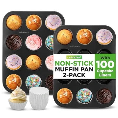 Durable non-stick muffin trays – Made from heavy-gauge carbon steel for long-lasting use and even heat. Perfect for baking muffins, cupcakes, and mini desserts at home or professionally Easy food release – Non-stick silicone coating ensures muffins come out easily with no tearing or sticking. Enjoy smooth baking and quick release every time Simple to clean – Dishwasher safe and easy to hand wash. The non-stick coating prevents residue build-up for a fast, hassle-free cleanup after baking Oven safe and strong – Crafted from 0.5 mm thick, food-grade carbon steel. Resists warping and withstands oven temperatures up to 230°C (450°F) Includes 100 cupcake cases – Comes with 100 parchment paper liners for easy use. Stackable design saves space and is ideal for muffins, cupcakes, and pastries, Weight: 2.91 Pounds, Manufacturer: NutriChef