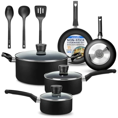 11-PIECE NONSTICK COOKWARE: Includes 0.89L and 1.90L sauce pots with lids 4.70L Dutch oven pot with lid 20cm and 25cm fry pans solid spoon slotted spatula and soup ladle PFOA FREE NON STICK COATING: Features durable nonstick interior for effortless food release healthier meals and easy cleaning with black heat-resistant lacquer exterior HEAT RESISTANT HANDLE GRIPS: Solid Italian bakelite handles offer comfortable safe grip with polished scratch-resistant edges that enhance the look of these kitchen pans TEMPERED GLASS LIDS: Includes see-through vented lids that retain moisture and allow steam escape helping distribute heat evenly up to 177°C for consistent results GAS ELECTRIC CERAMIC SAFE: Works on multiple cooktops made of 2.5mm pressed aluminium with 20-25um coating thickness and nonstick interior for everyday cooking use