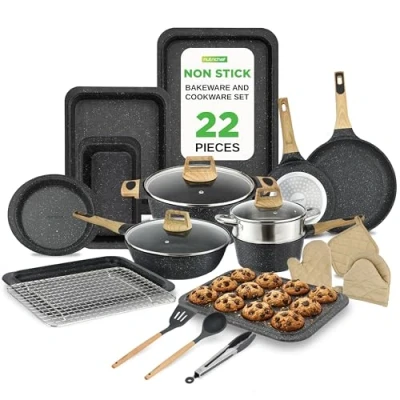 NON STICK COATING: Durable black cookware with PFOA and PFOS free marble coating for easy clean up and nonstick cooking performance MULTI SIZED COOKING POTS: Versatile pot set with glass lids includes small to large pans for all kitchen cookware needs USER FRIENDLY DESIGN: Food grade nonstick pots and pans set safe for use on induction ceramic electric and gas cooktops COOL TOUCH HANDLE GRIPS: Secure and heat resistant handles offer safe grip while using pan sets for cooking nonstick TEMPERED GLASS LIDS: See through lids retain heat and moisture for efficient cooking without lifting cover