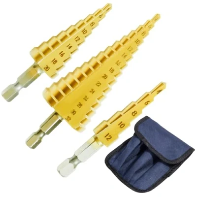 The Step Drill Bit set contains 3 sizes: 4-12mm, 4-20mm and 4-32 mm,Come with one portable fabric bag. 3 SIZES DRILL BITS SET INCLUDES: 5 steps: 4-12mm (4mm, 6mm, 8mm, 10mm, 12mm); 9 steps: 4-20mm (4mm, 6mm, 8mm, 10mm, 12mm, 14mm, 16mm, 18mm, 20mm); 15 steps: 4-32mm (4mm, 6mm, 8mm, 10mm, 12mm, 14mm, 16mm, 18mm, 20mm, 22mm, 24mm, 26mm, 28mm, 30mm, 32mm) High Quality: SS Step Bits are made of classic high-speed steel materials,with titanium coating.Provide good heat,wear and chip resistance,easy to drill and precise holes.The step drill bits are perfect for you to DIY. Wide Application:The Step drill bits can process different diameter holes,Idea for drilling holes in sheet metal,aluminum,brass,copper,wood,iron and plastic.Your best choice for DIY projects,furniture making or metalworking applications. Easy to Use:The bits have 1/4-inch hex shank,Easy to Fits and securely into most power drills tools to prevent slippage and shedding during rotation