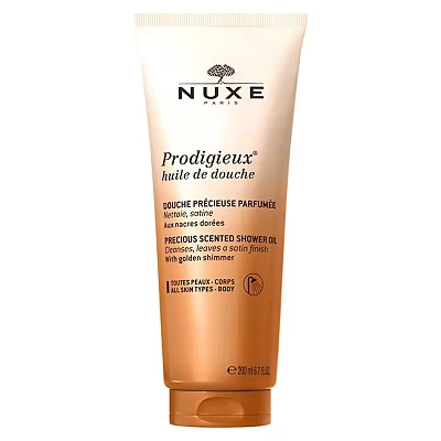 Nuxe Prodigieux Shower Oil 200 ml is a luxurious, eco-friendly cleanser with 94% natural ingredients and a biodegradable formula. It creates a silky foam with golden pearls, leaving skin clean, soft, and subtly perfumed.