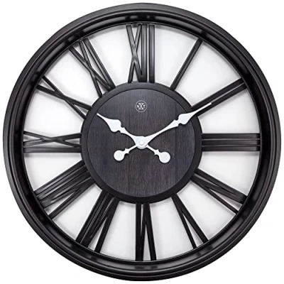 "Quebec" is a large (ø 51 cm) round wall clock Clock is made of plastic combined with glass, Black roman index, touch of black wood and white romantic style hands creates a lovely vintage look Clock works on 1 x AA battery (not included)