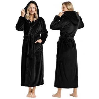 NY Threads Women Fleece Hooded Bathrobe Plush Long Robe, Black, Large