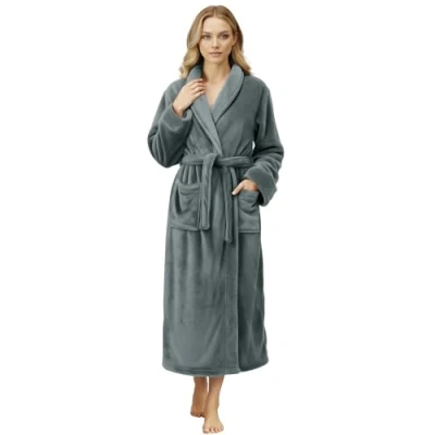 NY Threads Women Fleece Shawl Collar Bathrobe Plush Long Robe, Dark Grey, Medium