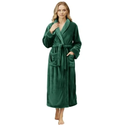 NY Threads Women Fleece Shawl Collar Bathrobe Plush Long Robe, Green, Medium