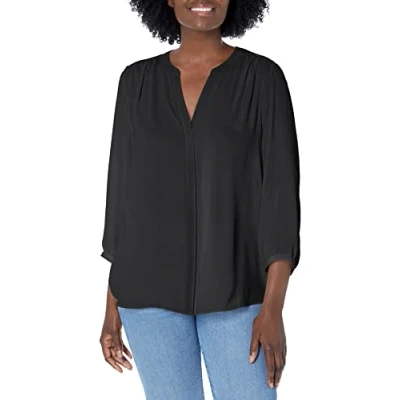 NYDJ Women's 3/4 Sleeve Pintuck Blouse, Black, X Large