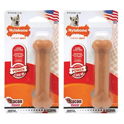 Nylabone Durabone bacon-flavored chew bones are perfect for small dogs. Made from nylon, they clean teeth while entertaining your pet. Ideal for powerful chewers, they encourage healthy chewing habits. Always supervise use and replace them if they become worn.