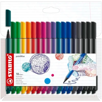 STABILO pointMax is available in 42 brilliant colours, perfect for taking down colourful notes at school, university or work The unique specially developed, robust nylon writing tip produces bold, crisp lines and helps emphasising important parts of your work Fast drying water based ink is ideal for left handers - no smudged handwriting Excellent writing comfort - for even the most prolific note taker - The 0.8mm medium tip is ideal for clean clear writing and drawing Handy pen length and practical clip for on the go - Cap can be attached to the end of the pen