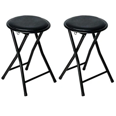 Quality: The chairs are made of high-quality tabular steel frame making it strong and durable. The seat and the back rest are covered with sponge padding giving users great comfort even when using for hours. Practicality: These chairs are very easy to wipe and clean. Also, can be easily folded flat for storage when not in use. A perfect chair to be used for offices, homes, schools, events, village halls, desks, computers, receptions areas or just for an extra spare seating when needed. In addition, four rubber bumpers are fitted on the base to prevent any slips or scratches when using on a hard or slippery surface. Dimensions: When Folded: Height: 68.5cm Width: 30cm Depth: 6cm; When Unfolded: Height: 45cm Width: 30cm Depth: 30 Package Quantity: 2 X Black Stool Chair
