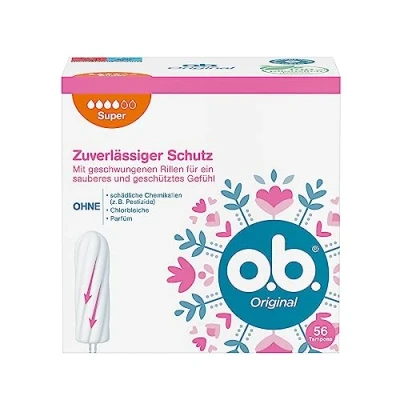 Curved grooves for reliable protection: The o.b. Original Super Tampons with curved grooves efficiently direct liquid into the interior of the tampon for a clean feel StayDry technology for a dry return band: the return ribbon of the o.b. Original Super Tampons stay dry thanks to StayDry technology for a clean feel The o.b. Original Super Tampons contain a 100% plant-based tampon core and are free from harmful chemicals (e.g. pesticides), chlorine bleach and perfume. They are also gynaecologically tested Product contains plastic, do not dispose of in the toilet, throw in the bin after use, help protect the environment Box contents: 1 x 56 pieces o.b. Original super tampons to reliably get through the days