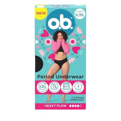 PERFECT FIT: Period pants for women in size 20-24 with Form Flex design that adapts to your body, providing a super comfortable and secure fit for all-day dryness* and feels like your regular underwear LEAK PROTECTING TECHNOLOGY: These period knickers with leak protecting technology provide up to 12 hours of protection, is machine washable at 60°, and reusable for up to 4 years** STAY WORRY-FREE: The menstrual period underwear with a skin-touching breathable top layer wicks away blood in seconds, a waterproof layer, and sealed side seams to provide reliable leak protection STAY DRY AND PROTECTED: The reusable period pants have an absorbent core that locks up blood for up to 12 hours, and using 1 panty replaces up to 4 pad changes PRODUCT DETAILS: o.b. Leakproof Period Underwear for heavy flow** in XL/XXL size with 100% organic cotton top layer, absorbent core and waterproof layer are reusable with body shape-adapted fabric