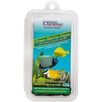 Nutritious food for algaegrazing marine fish Green Marine Algae is firmer than red and often preferred by fish that graze on turf algae Enhanced with a natural garlic extract to entice finicky eaters Feed using Ocean Nutritions Feeding Frenzy Seaweed Clips Ideal for tangs rabbitfish marine angelfish inverteates herbivorous freshwater fish and more