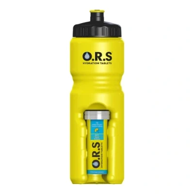 The O-Bottle sports hydration bottle comes with built-in space for a tube of 12 Lemon O.R.S Hydration Tablets for rapid re-hydration; Great for sports; travel; hot weather; cycling; running or the gym Fast proven hydration - O.R.S oral hydration tablets are formulated by pharmacists and healthcare experts to provide fast; effective rehydration; Simply drop; dissolve; drink for rapid refreshment Sports water bottle with tabs for adults; children and teens; The tasty low-calorie lemon flavour soluble vegan tablets are made with natural flavours; free from preservatives; gluten and lactose free Suitable for the whole family – The ORS Hydration low-calorie glucose (17kcal) effervescent formula is suitable for vegans and vegetarians; free from artificial preservatives; gluten and lactose-free Formulated by pharmacists to World Health Organisation oral rehydration standards; for a reliable hydration formula that's both safe and effective; Includes 1 x O-Bottle water bottle and 12 Tablets