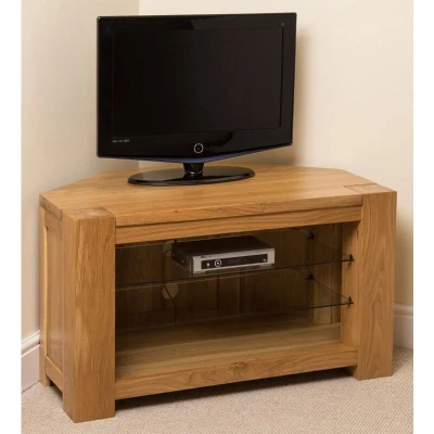 General description The Kuba solid oak corner TV unit is a stunning piece of furniture that serves as the ideal solution for housing large flat-screen TVs and video equipment. This range of oak living room furniture combines beauty with functionality, making it a practical and stylish addition to any living room. Technical specifications Material: Solid oak wood Dimensions: Length - 104 cm, Depth - 61 cm, Height - 60 cm Top thickness: 3.5 cm Leg dimensions: 12 cm x 12 cm Features: 2 adjustable/removable tempered glass shelves, cable holes for wire management Installation No assembly required; delivered fully assembled Usage Ideal for living room entertainment, accommodating large flat-screen TVs and home entertainment systems Other information Quality craftsmanship with attention to detail Delivered securely packed to ensure perfect condition upon arrival