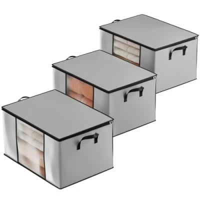 Oak & Tea Storage Bags 90L 3 Pack, Moving Wardrobe Organiser with Lid Zips, PE Coated Woven Fabric Waterproof Box Clear Window for Clothes, Blankets, Bedding 60x43x35cm